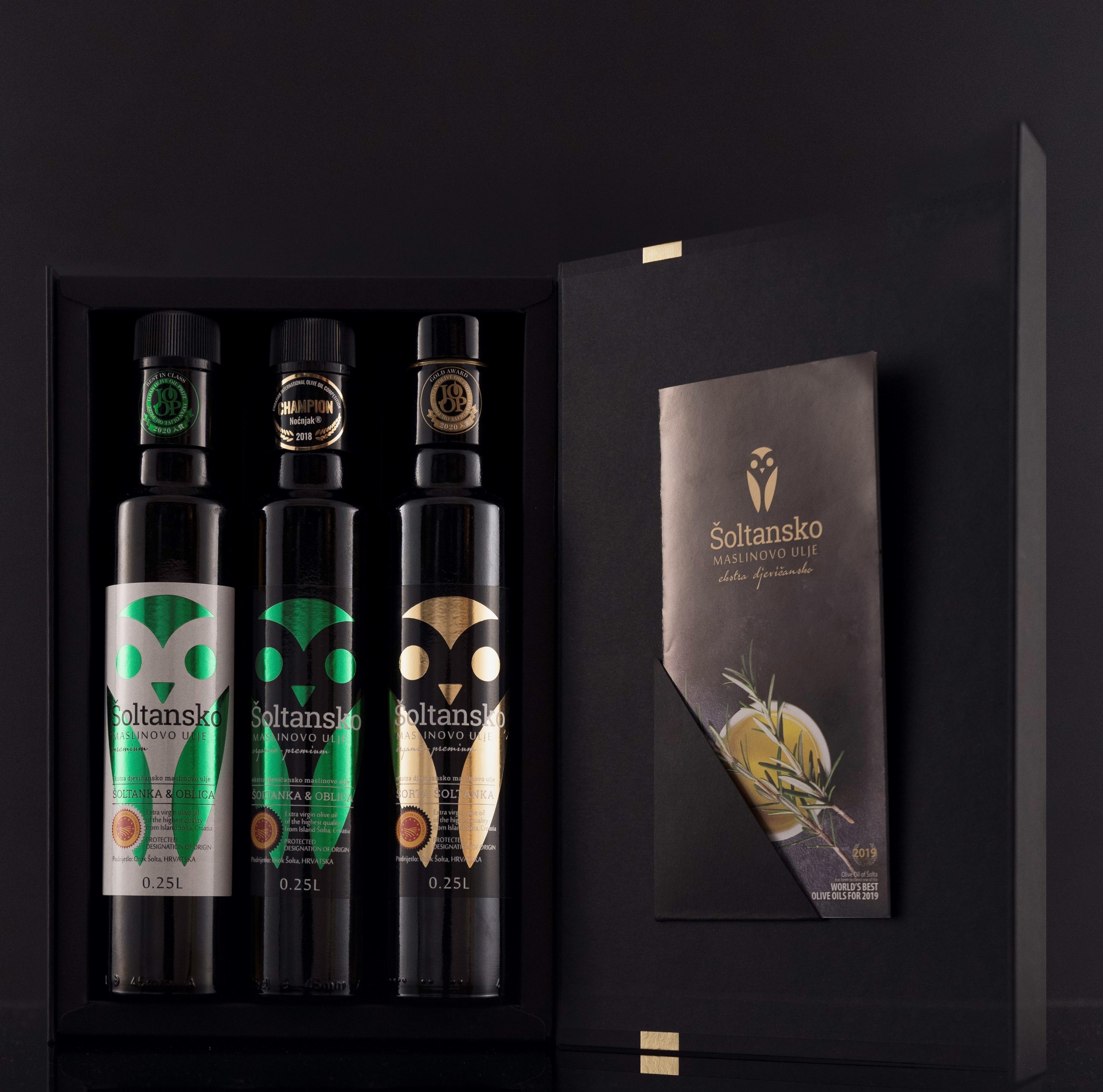 Elegantna crna poklon kutija skriva 3 visoko nagrađivana maslinova ulja sa Šolte. Sva 3 ulja imaju zaštitu izvornosti, što je potrošaču garancija da su masline uzgojene na Šolti, da je prerada odrađena u uljari na Šolti, da je obavljena kemijska i senzorska analiza pokazala da je ulje u skladu sa strogim kriterijima iz specifikacije i konačno, da je ulje punjeno u boce na Šolti. Tek takovo ulje smije napustit otok Šoltu!